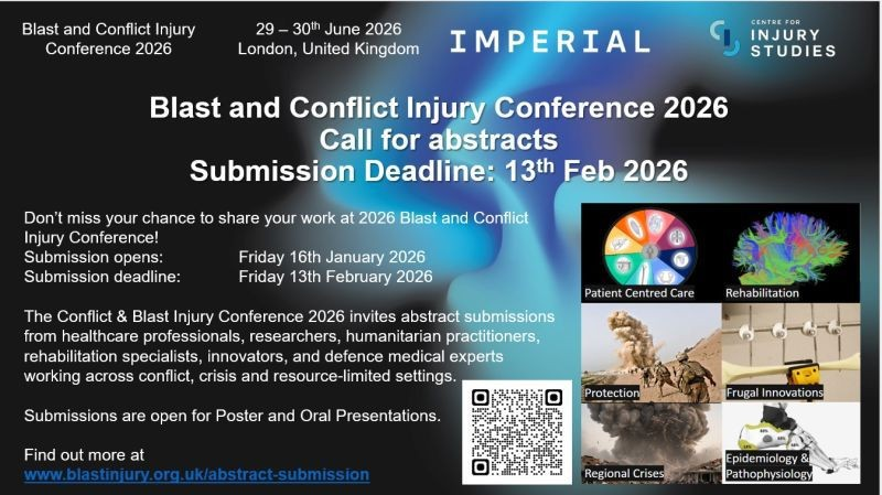 Blast and Conflict Injury Conference 2026 29th and 30th of June 2026 at the South Kensington Campus, Imperial College London Student entry: £30 https://www.blastinjury.org.uk/